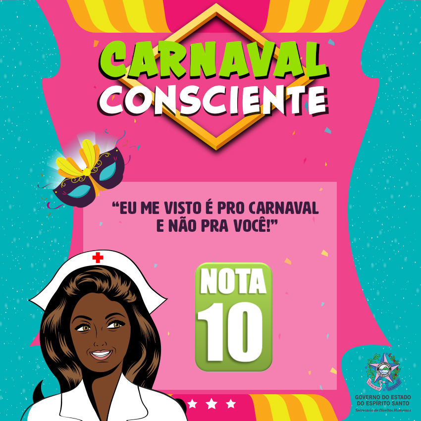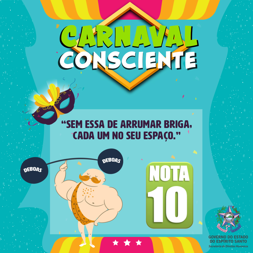 A Secretaria de Estado de Direitos Humanos lançou no dia 1º de fevereiro a campanha #CarnavalConsciente, na página de Facebook @DireitosHumanosES para promover o respeito aos direitos de todos durante a folia – e depois que ela acabar também. Serão nove mensagens com o objetivo de conscientizar o folião sobre suas atitudes nota 0 e nota 10.