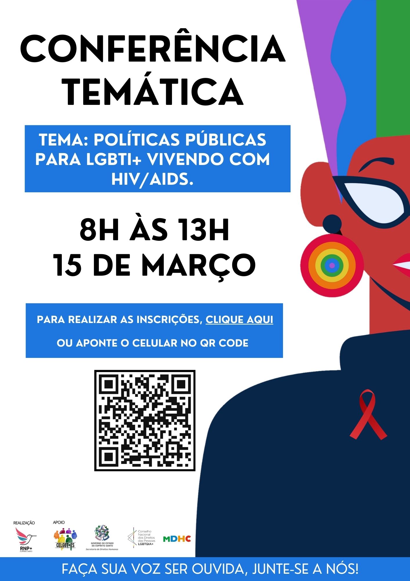O Conselho Estadual LGBT, com apoio da Secretaria de Direitos Humanos (SEDH) e da Rede Nacional de Pessoas Vivendo com HIV/AIDS/ES (RNP+), realiza no próximo sábado (15), a Conferência Temática “Políticas Públicas para LGBTI+ Vivendo com HIV/Aids”. Os interessados podem fazer sua inscrição por meio de formulário. Acesse