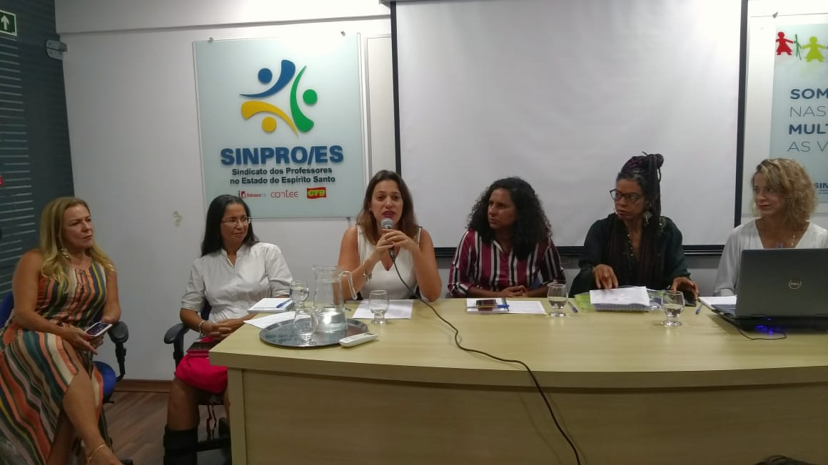 Mulher é sinônimo de resistência! E foi esse o tema abordado na mesa-redonda “Mulher: Realidade, Violência e Luta”, realizada pelo Sindicato dos professores no Estado do Espírito Santo (SINPRO/ES), em sua sede, no dia 22 de março, às 19h30, com a participação de Jacqueline Moraes, Vice Governadora do Estado do Espírito Santo, Larissy Soares, professora e coordenadora da ala de Passistas da Escola de Samba Novo Império, Nara Borgo, Secretária Estadual dos Direitos Humanos, Heloísa Carvalho, Coordenadora do Fórum Nacional de Mulheres Negras e Andrea Nascimento, psicóloga e professora da Universidade Federal do Espírito Santo (Ufes).