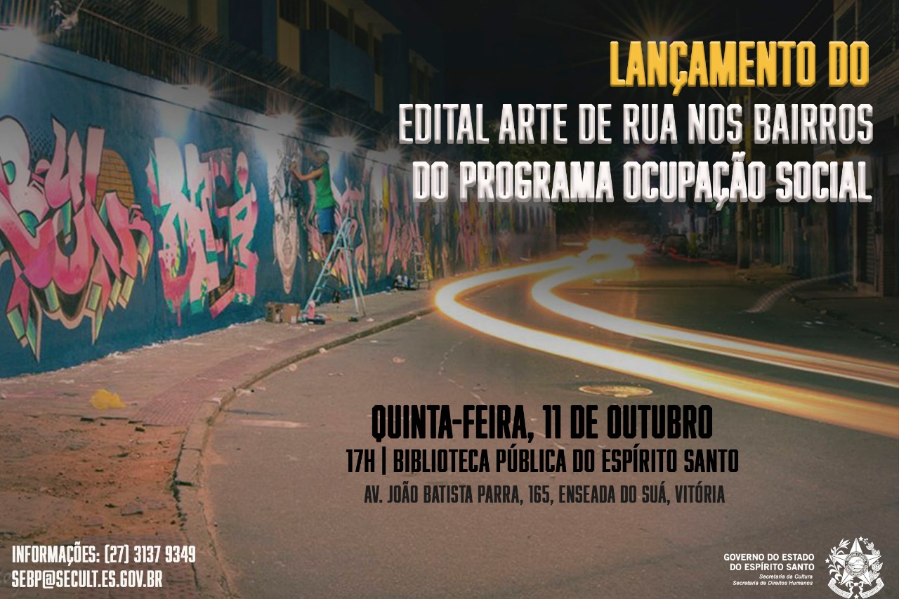 Será lançado nesta quinta-feira (11), na Biblioteca Pública Estadual, em Vitória, às 17h, o Edital 046/2018 - Seleção de Projetos de Arte de Rua nos Bairros do Programa Estruturante Ocupação Social no Estado do Espírito Santo. O objetivo é fortalecer e incentivar as manifestações artísticas desenvolvidas pela sociedade nos espaços públicos dos bairros envolvidos. O edital será publicado nesta quinta-feira (11) no site da Secult. A iniciativa é das secretarias de Estado da Cultura (Secult) e de Direitos Humanos (SEDH).