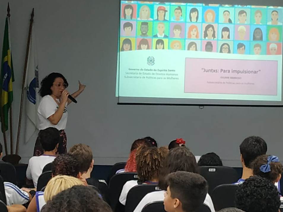 A palestrante foi a subsecretária de Estado de Políticas para Mulheres, Juliane Barroso. Para o evento foram convidados alunos entre 11 e 15 anos do 6° ao 9° do Ensino Fundamental.