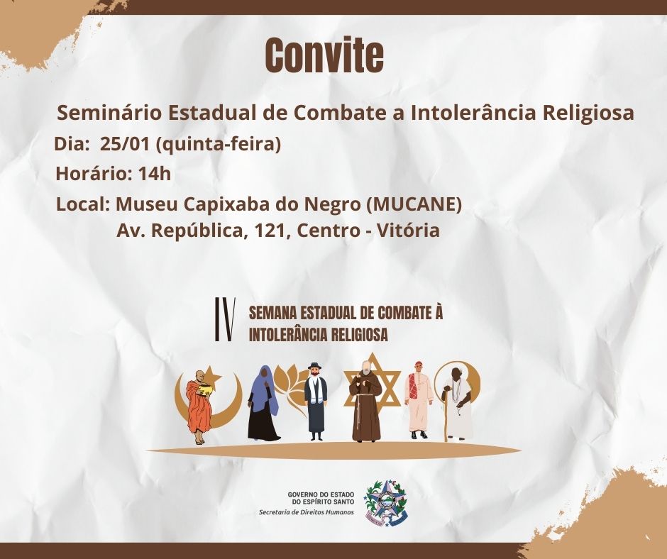A Secretaria de Direitos Humanos (SEDH), por meio da Gerência de Políticas de Promoção da Igualdade Racial (GEPIR), realiza, nesta quinta-feira (25), o Seminário Estadual de Combate a Intolerância Religiosa. O evento tem início às 14 horas e acontece no Museu Capixaba do Negro (Mucane), no Centro de Vitória. A atividade integra a IV Semana Estadual de Combate à Intolerância Religiosa.