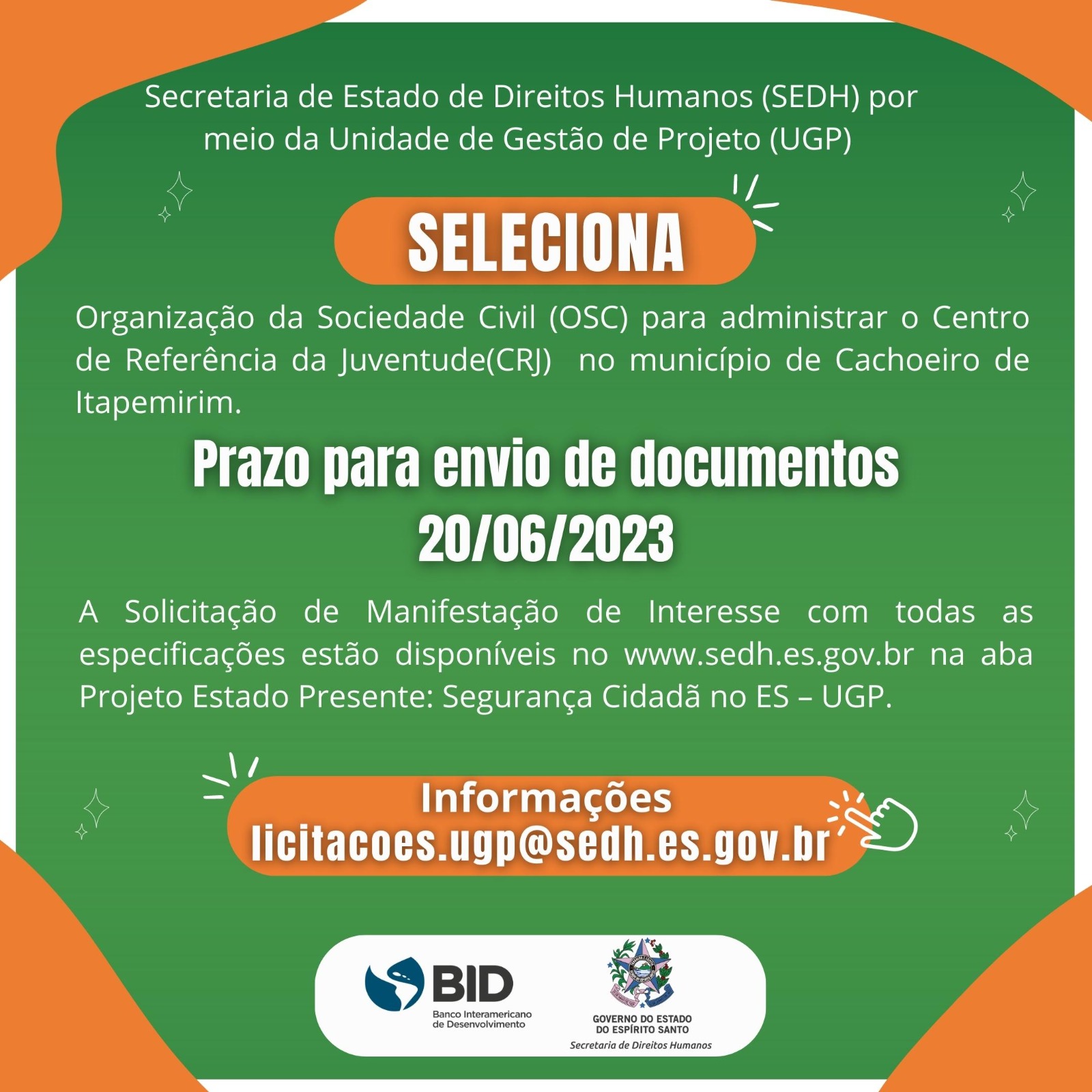 A Secretaria de Direitos Humanos (SEDH), por meio da Unidade de Gestão de Projeto (UGP), está selecionando uma Organização da Sociedade Civil (OSC) para administrar o Centro de Referência das Juventudes (CRJ), localizado no município de Cachoeiro de Itapemirim. O prazo para a manifestação de interesse é até o dia 20 de junho.