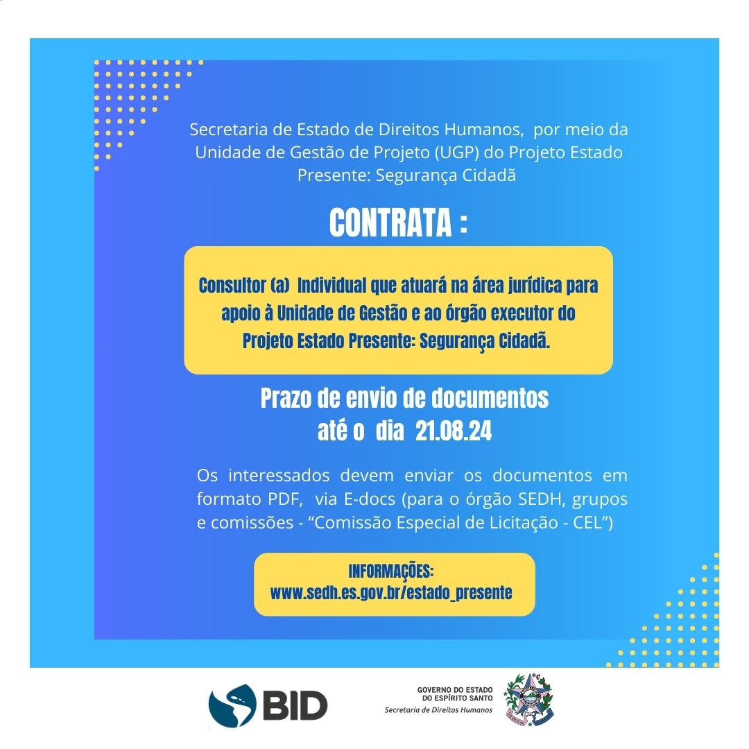 A Secretaria de Direitos Humanos (SEDH) publicou, nesta quinta-feira (08), a Manifestação de Interesse para contratar Consultor Individual que atuará na área jurídica, em apoio à Unidade de Gestão e ao órgão executor do Projeto Estado Presente: Segurança Cidadã. Os interessados devem enviar a Manifestação de Interesse até o dia 21 de agosto. Confira o edital